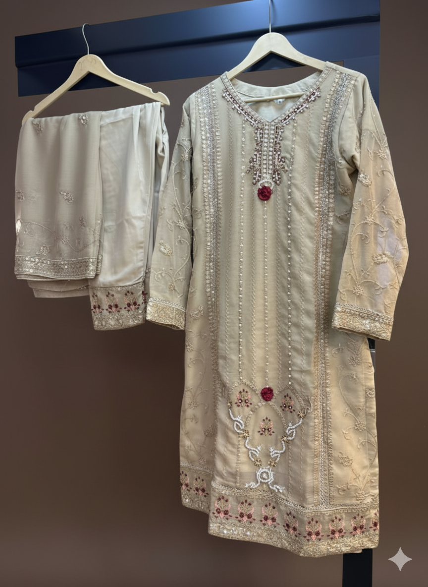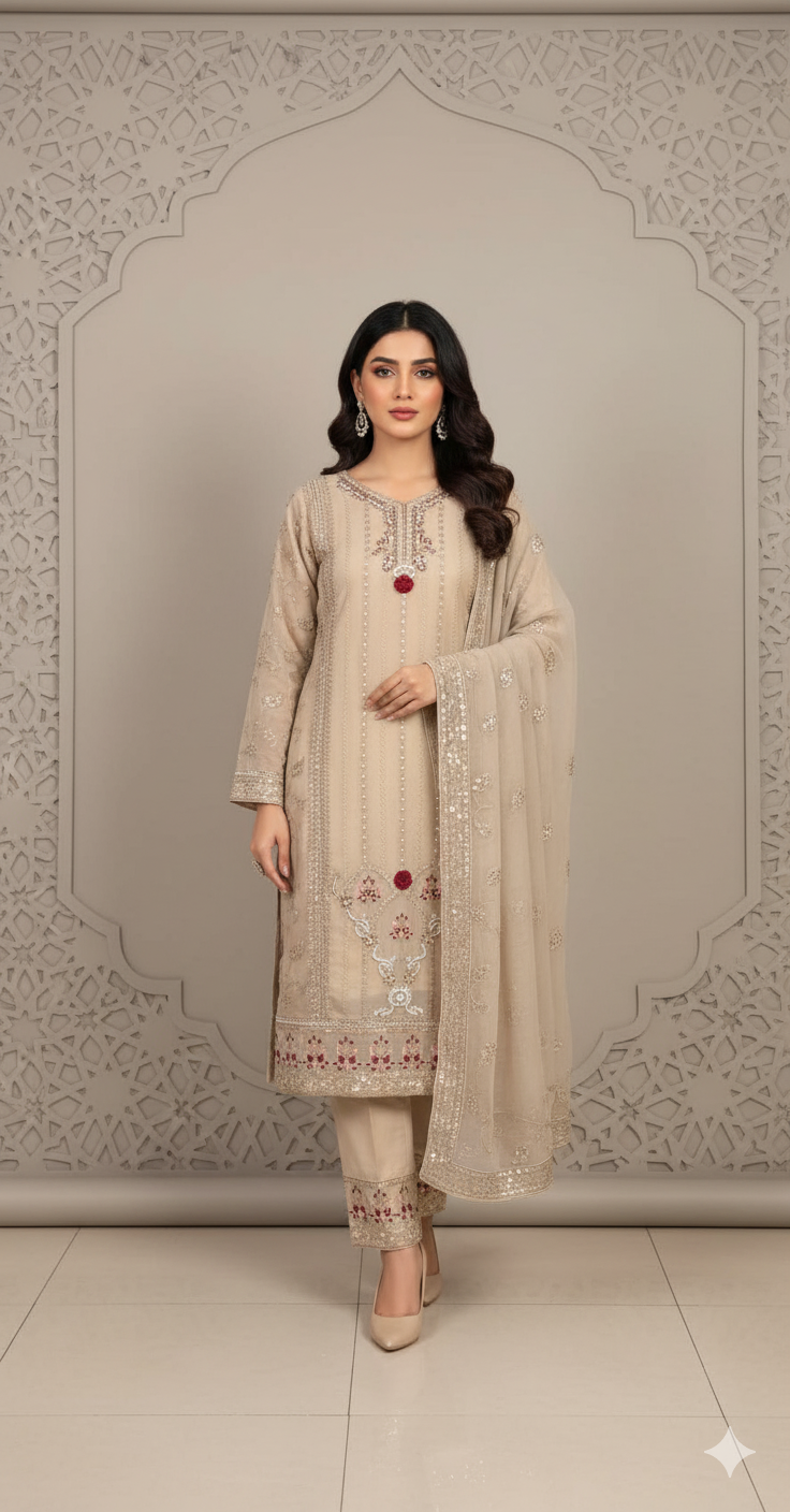 3-piece stitched chiffon suit perfect for semi-formal and formal occasions.