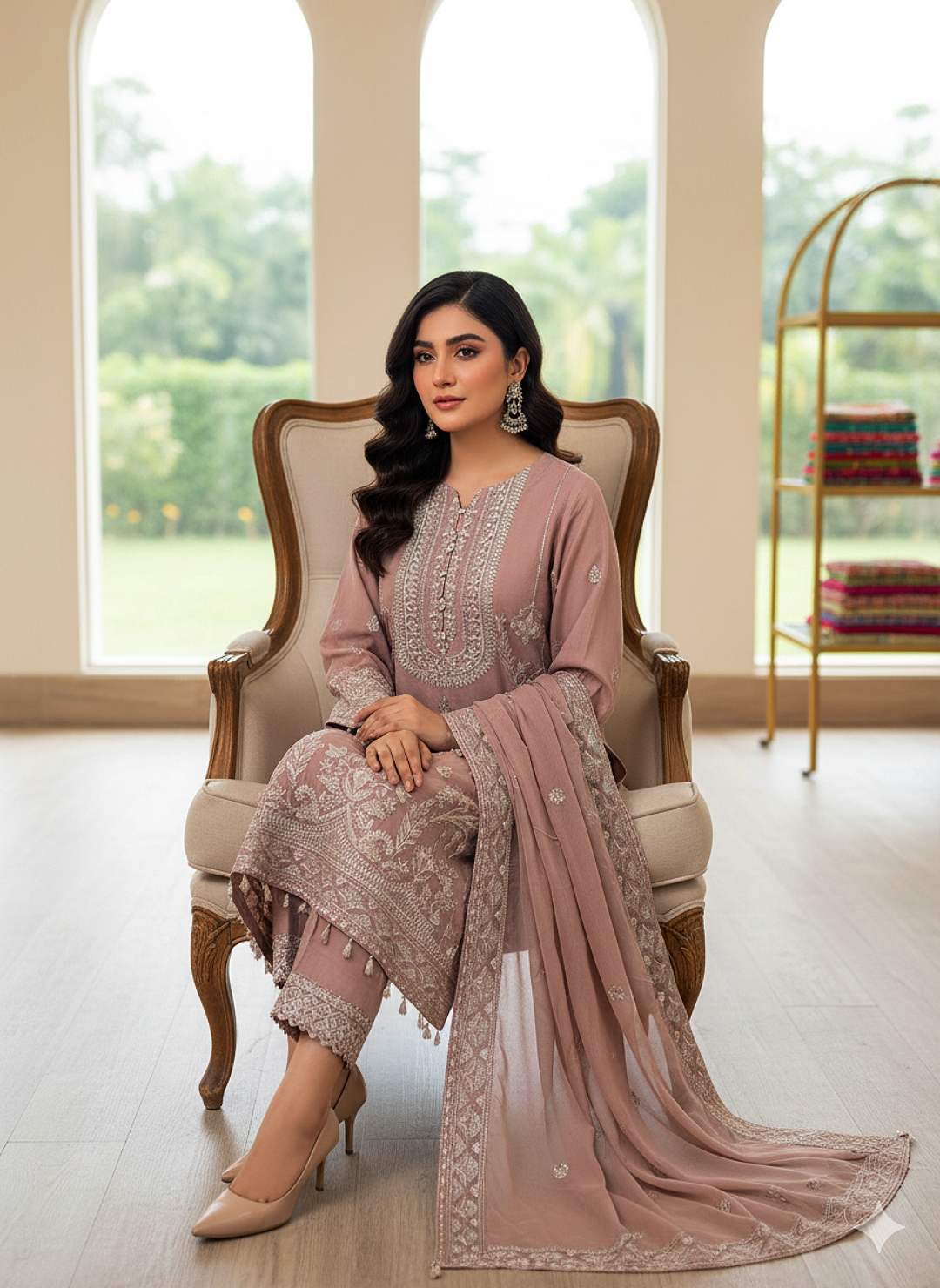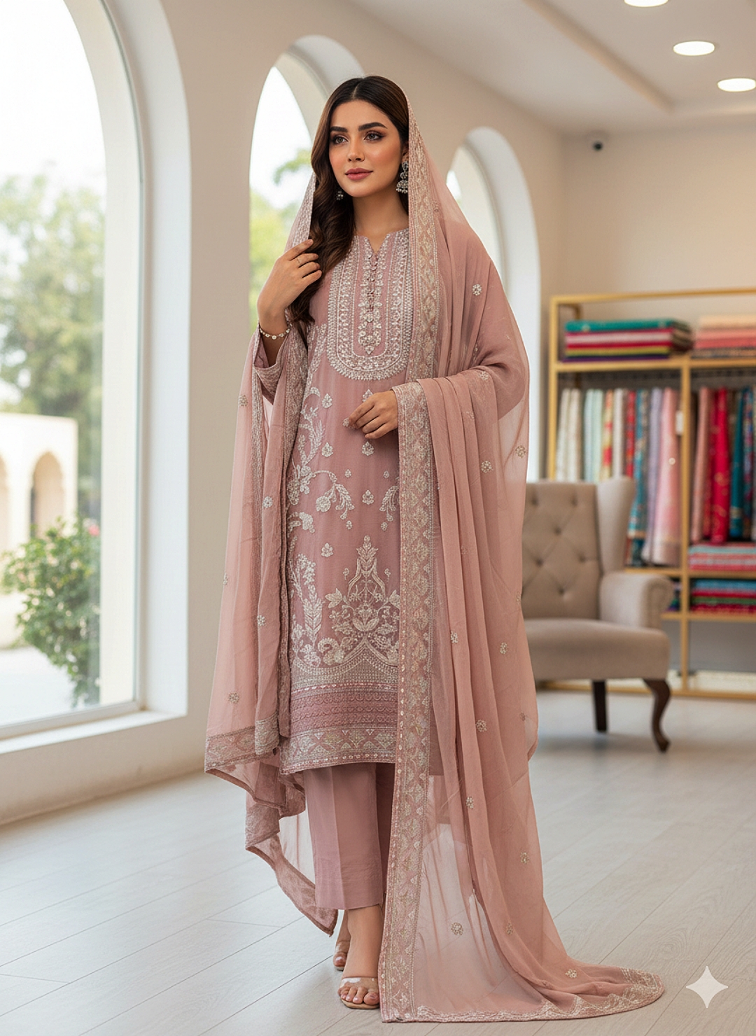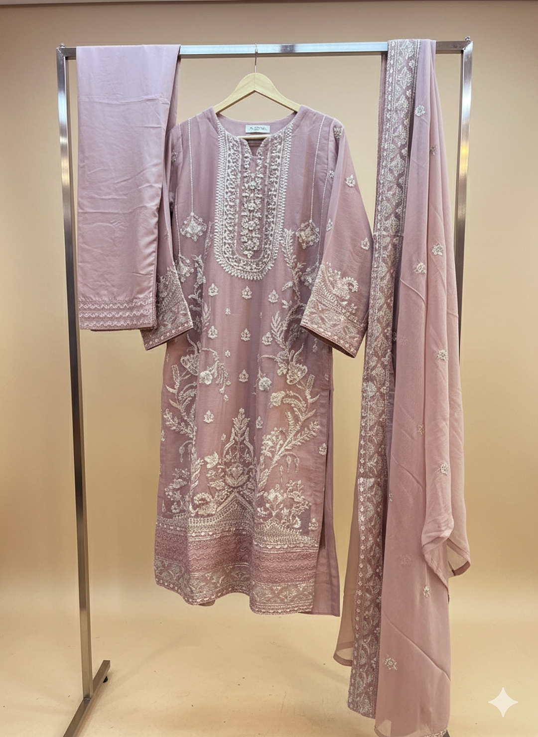 3-piece stitched chiffon suit perfect for semi-formal and formal occasions.