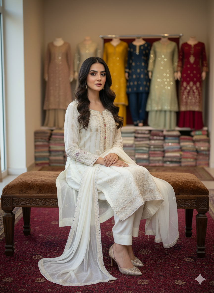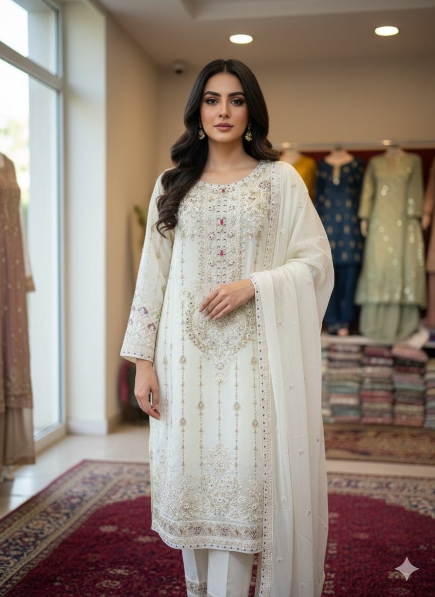 3-piece stitched chiffon suit perfect for semi-formal and formal occasions.