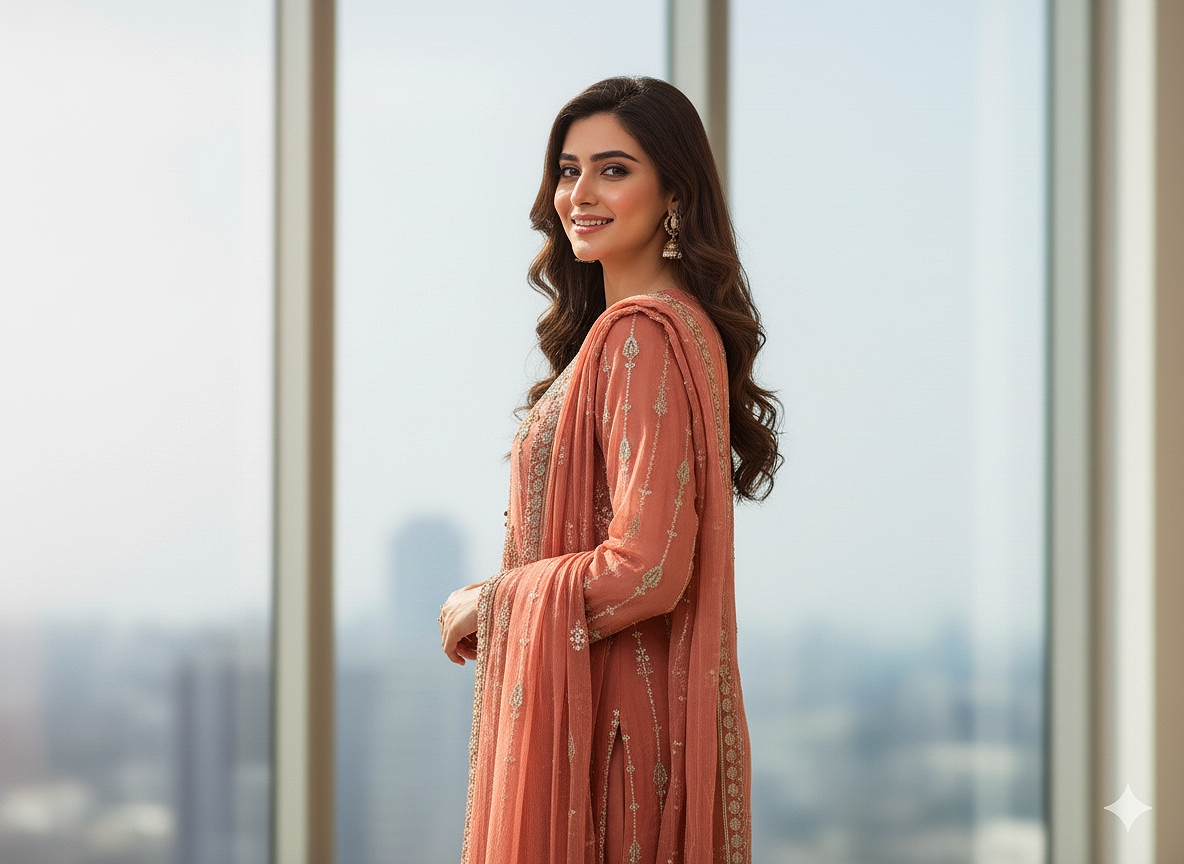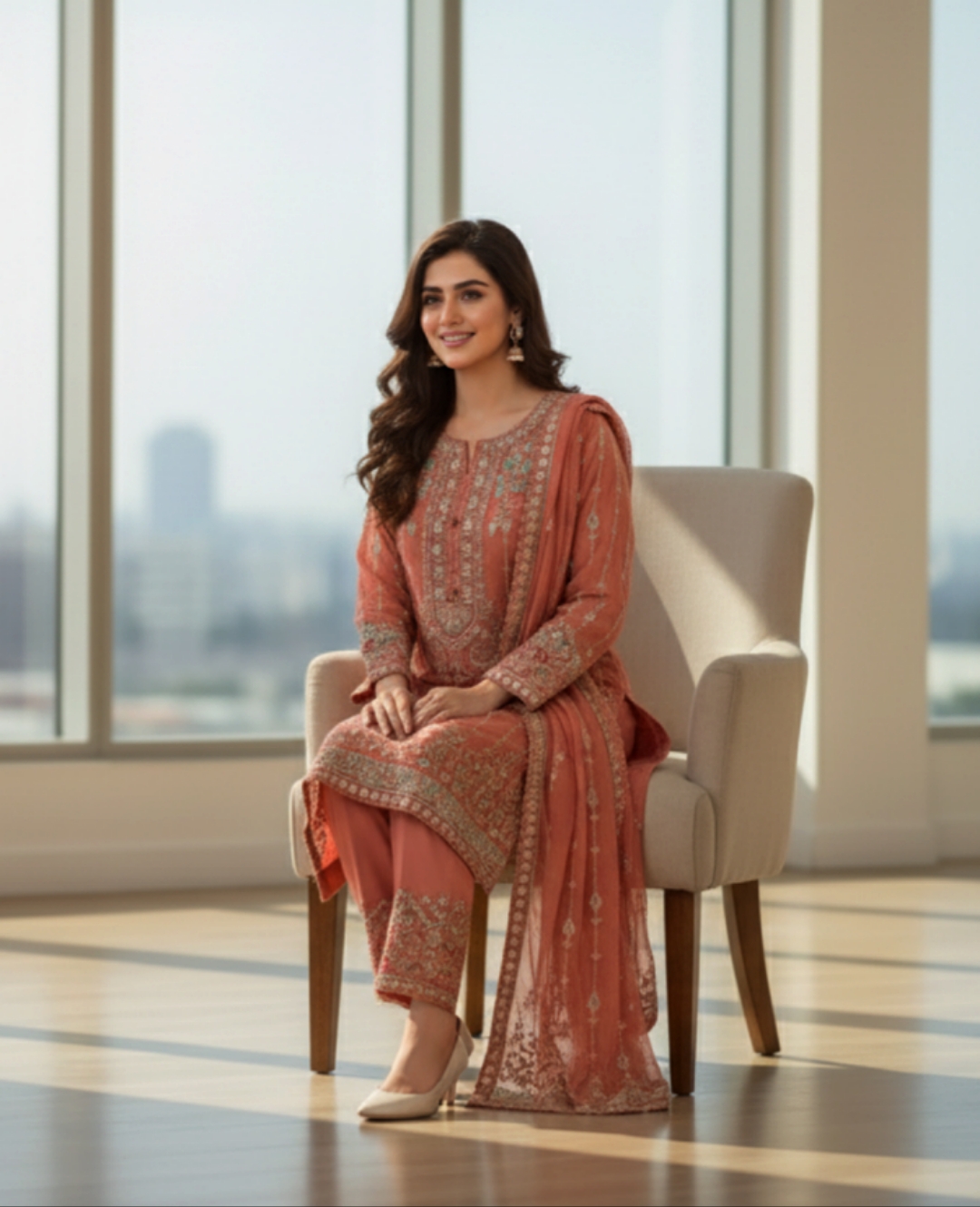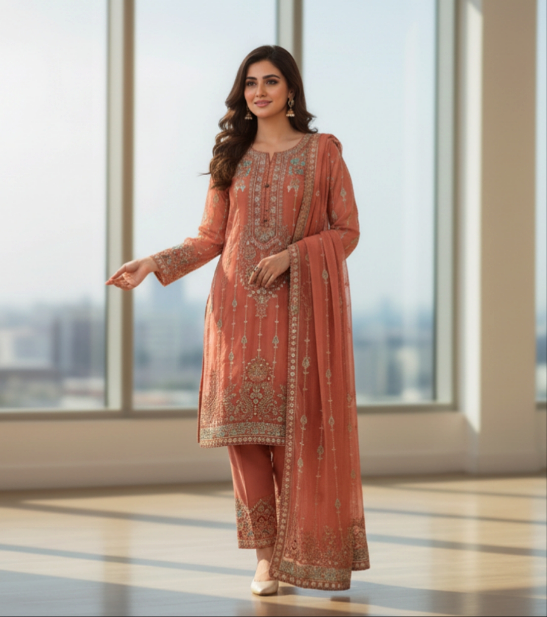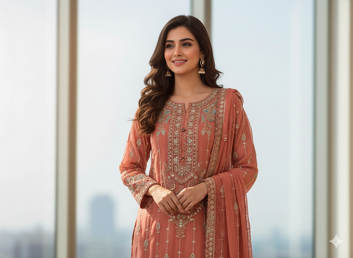 3-piece stitched chiffon suit perfect for semi-formal and formal occasions.