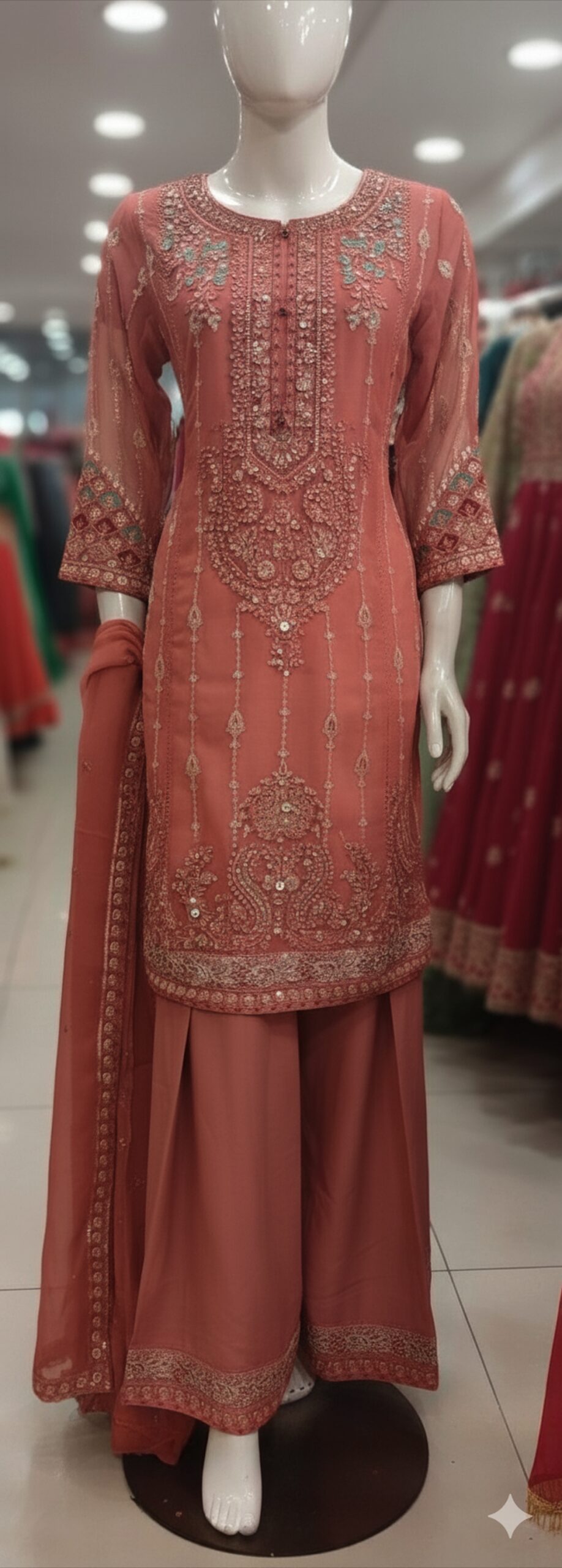 - Dupatta: Embroidered chiffon dupatta.