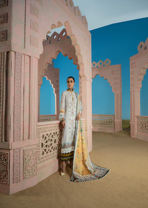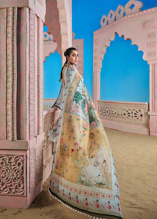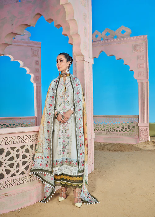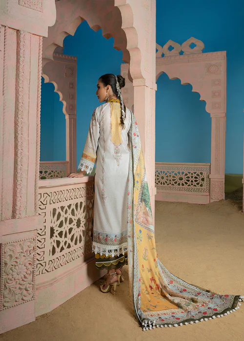 Additional Description: Immersed in the splendor of majestic Mughal gardens, this ivory ensemble, crafted from premium lawn, embodies timeless elegance. Adorned with exquisite floral prints, delicately intertwined with intricate cutwork lace borders gracing the front, back, and sleeves. Paired harmoniously, a bright lush silk dupatta emerges, depicting the rich tapestry of Mughal flora and architecture, infusing the ensemble with a vibrant allure.